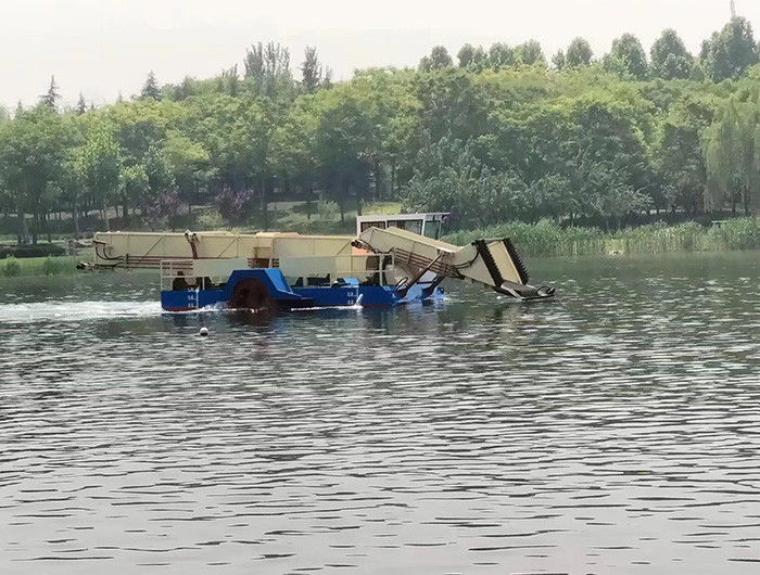 De maai boot is een moderne apparatuur voor het oogsten en transporteren van waterplanten en waterhyacinten geschikt
